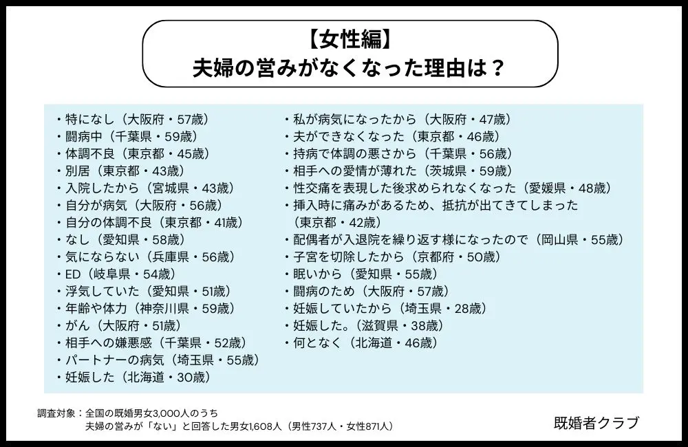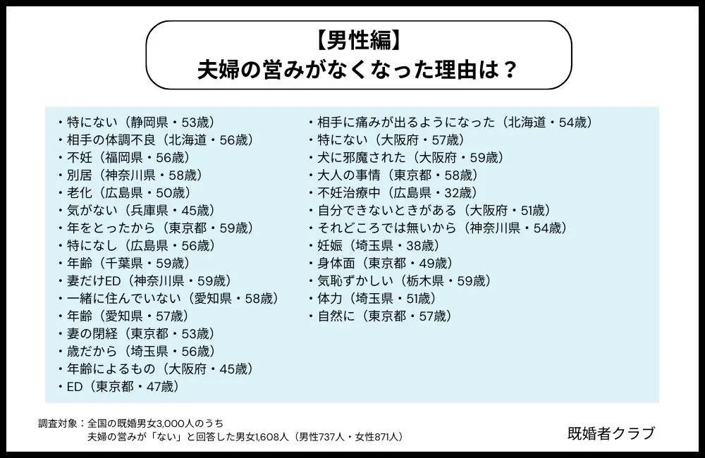 身体的な理由としては、「自分ができないときがある」といったことが挙げられるほか、「妻が体調不良または閉経している」ことが挙げられています。