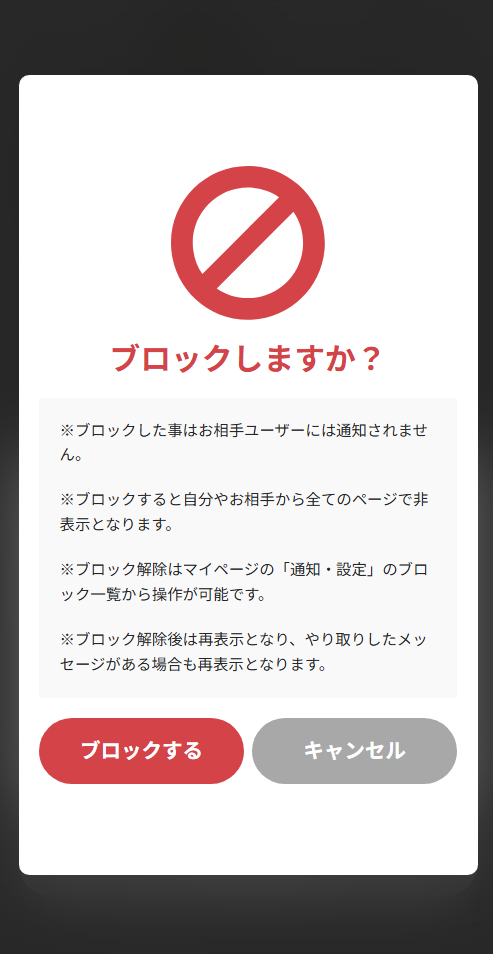ブロックは、特定のお相手とのやり取りを停止したいときに利用できる機能です。