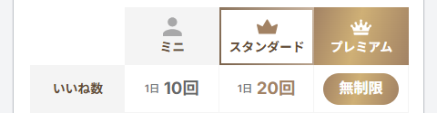無料会員、ミニプランでは1日最大10回、スタンダードプランでは最大20回、そしてプレミアムプランでは無制限に「いいね」を送ることができます。