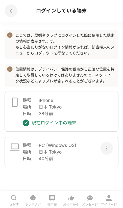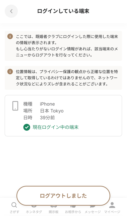 マイページの【通知・設定】の【設定】の中にある【ログインしている端末】の項目から、現在ログインしている端末の確認や、端末からのログアウトが可能です。