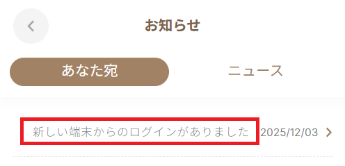新しい端末からログインがあった場合、お知らせに通知が届きます。覚えのない端末からログインがあった場合は【ログインしている端末】をご確認ください。